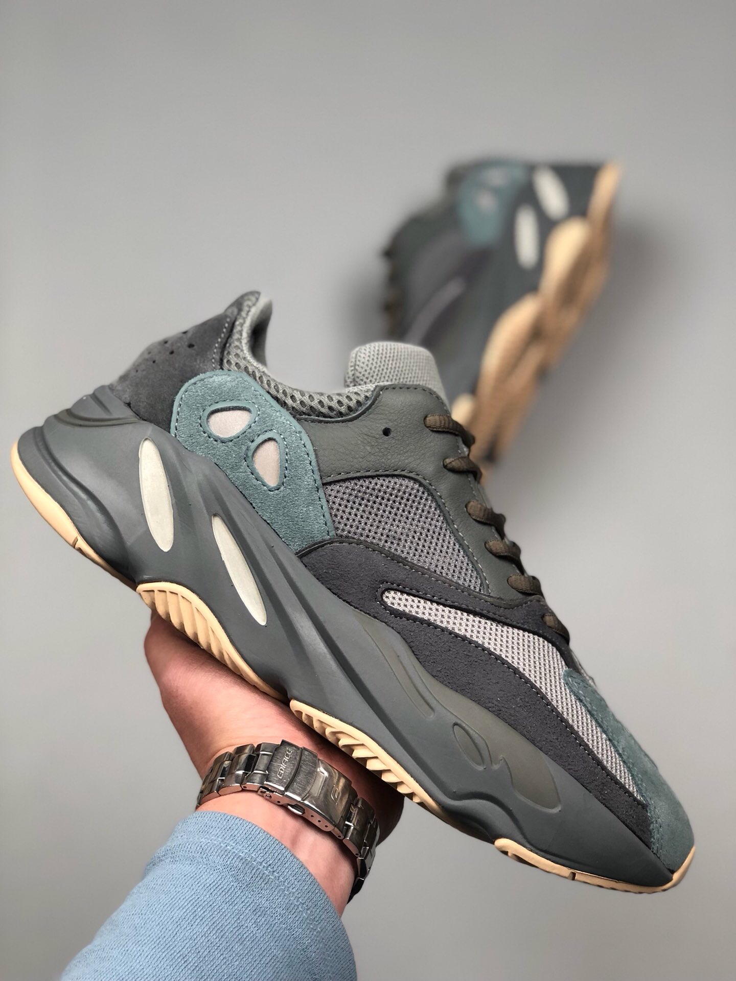 blue and orange yeezy for sale, yeezy 700 teal blue on feet