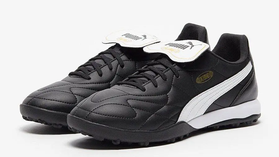 Unleash your A game on both offence and defence as you confidently play in the PUMA King Top TT. This modern-day astroturf football shoe continues the highly admired PUMA King franchise that debuted in 1968, popularised by football icons like Diego Maradona and Pelé. The PUMA King Top TT “Puma Black” flaunts luxe detailing inspired by old-school football silhouettes, outfitted in an all-black kangaroo leather upper with a premium quilted front section for better ball control.