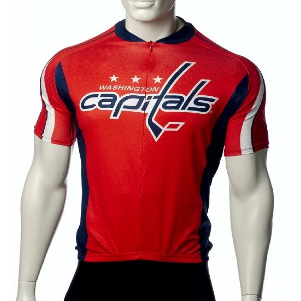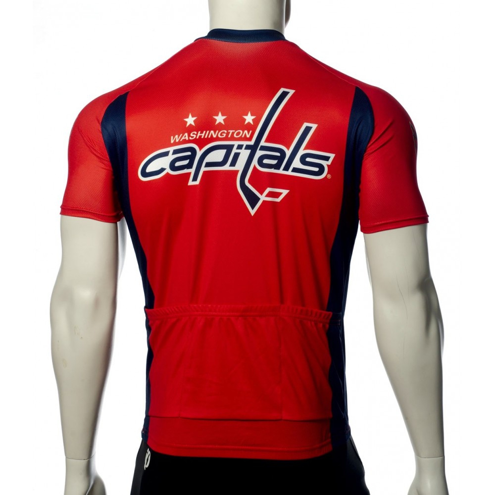The jersey features a vibrant red base with bold white and navy blue accents. The "Washington Capitals" logo is prominently displayed across the chest, accompanied by three stars, adding a touch of team spirit to your ride. The fabric is lightweight yet durable, providing excellent breathability and moisture-wicking properties to keep you cool and dry throughout your journey. The short sleeves are fitted but not restrictive, allowing for full range of motion.