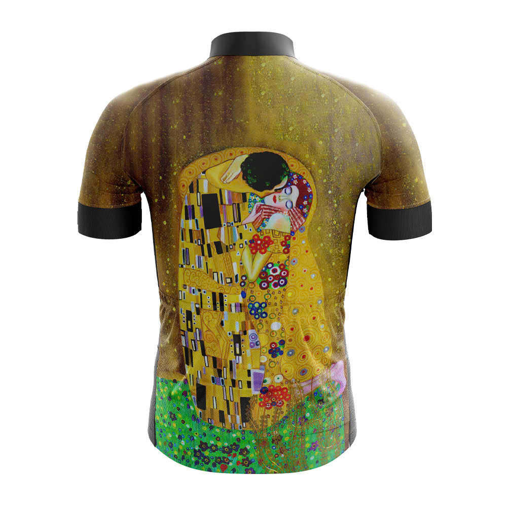 Introducing the Golden Art-themed Cycling Jersey, a masterpiece of cycling apparel that seamlessly blends the elegance of Gustav Klimt's iconic "The Kiss" with the functionality of high-performance cycling gear. This jersey is not just a garment; it's a canvas of artistry and comfort.
