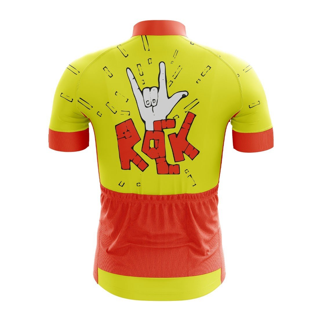 Introducing the Exciting Yellow & Red Cycling Jersey Challenge, a vibrant and eye-catching addition to any cyclist's wardrobe! This cycling jersey is designed to make you stand out on the road or trail. The bright yellow base color exudes energy and positivity, while the bold red accents add a touch of passion and intensity. The jersey features a unique design with a large, stylized "ROCK" graphic in red, accompanied by a dynamic hand gesture that mimics the iconic rock sign. This design not only looks cool but also adds a playful element to your cycling gear.