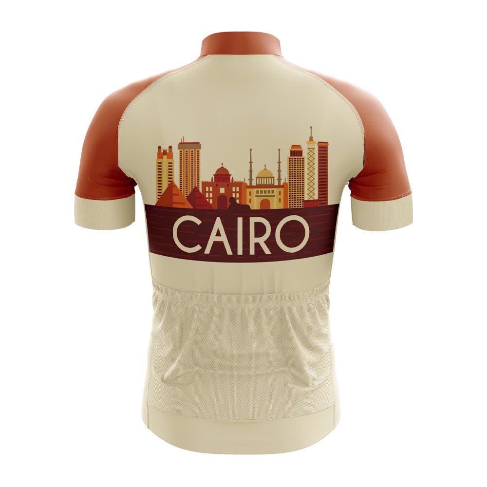 The front of the jersey showcases an intricate design of Cairo's iconic skyline, featuring domes, minarets, and towering skyscrapers. The word "CAIRO" is prominently displayed in bold, gold lettering, adding a touch of elegance and pride to the overall look. The design is both eye-catching and culturally significant, making it a perfect choice for cyclists who want to show their love for the city.