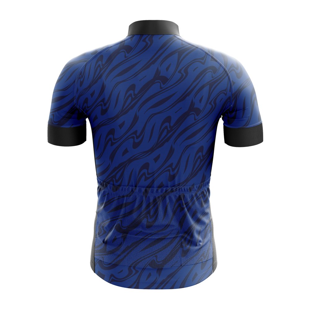 Complementing the jersey is a matching bib short in the same navy blue hue, featuring a white back panel for added breathability and visibility. The shorts have a unique cut that provides excellent coverage and support, ideal for long-distance rides or competitive events. The waistband is elasticated for a secure fit, and the side panels are slightly tapered for enhanced aerodynamics. The shorts also incorporate padded areas in the crotch region for added comfort during extended periods of cycling.