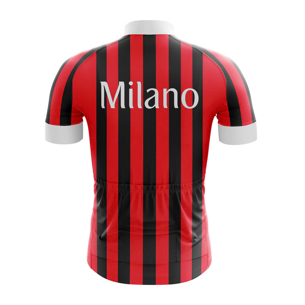 At the center of the chest, the word "Milano" is elegantly printed in crisp white letters, adding a personal touch and a sense of pride. The collar is a clean, white color that complements the overall design, providing a sharp contrast against the bold stripes. Short sleeves are finished with white accents at the cuffs, offering a subtle detail that enhances the jersey's aesthetic appeal.