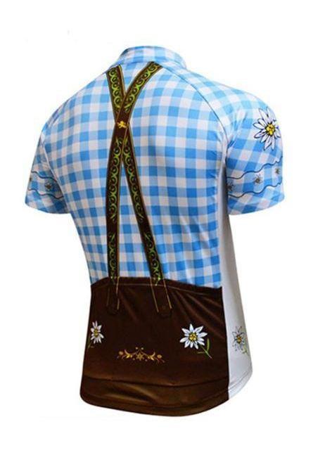 The jersey features a classic blue and white checkered pattern reminiscent of traditional Bavarian lederhosen, adorned with gold accents that add a touch of elegance. The fabric is lightweight, breathable, and quick-drying, ensuring you stay cool and dry during intense rides. The short sleeves provide excellent ventilation, making it ideal for hot summer days. The jersey also includes functional pockets for storing essentials like keys, energy gels, or a small water bottle.