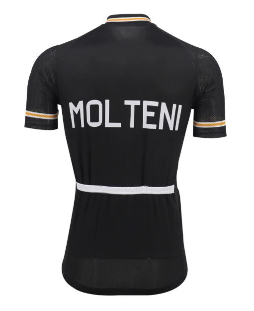 The jersey's sleek black colorway is accentuated by bold white lettering spelling out "MOLTENI" across the chest, instantly evoking a sense of nostalgia for cycling's golden era. The Italian flag emblem subtly embroidered on the left side adds a touch of national pride and authenticity to your ride. The short sleeves are adorned with gold accents, providing just enough flair without overpowering the overall design.