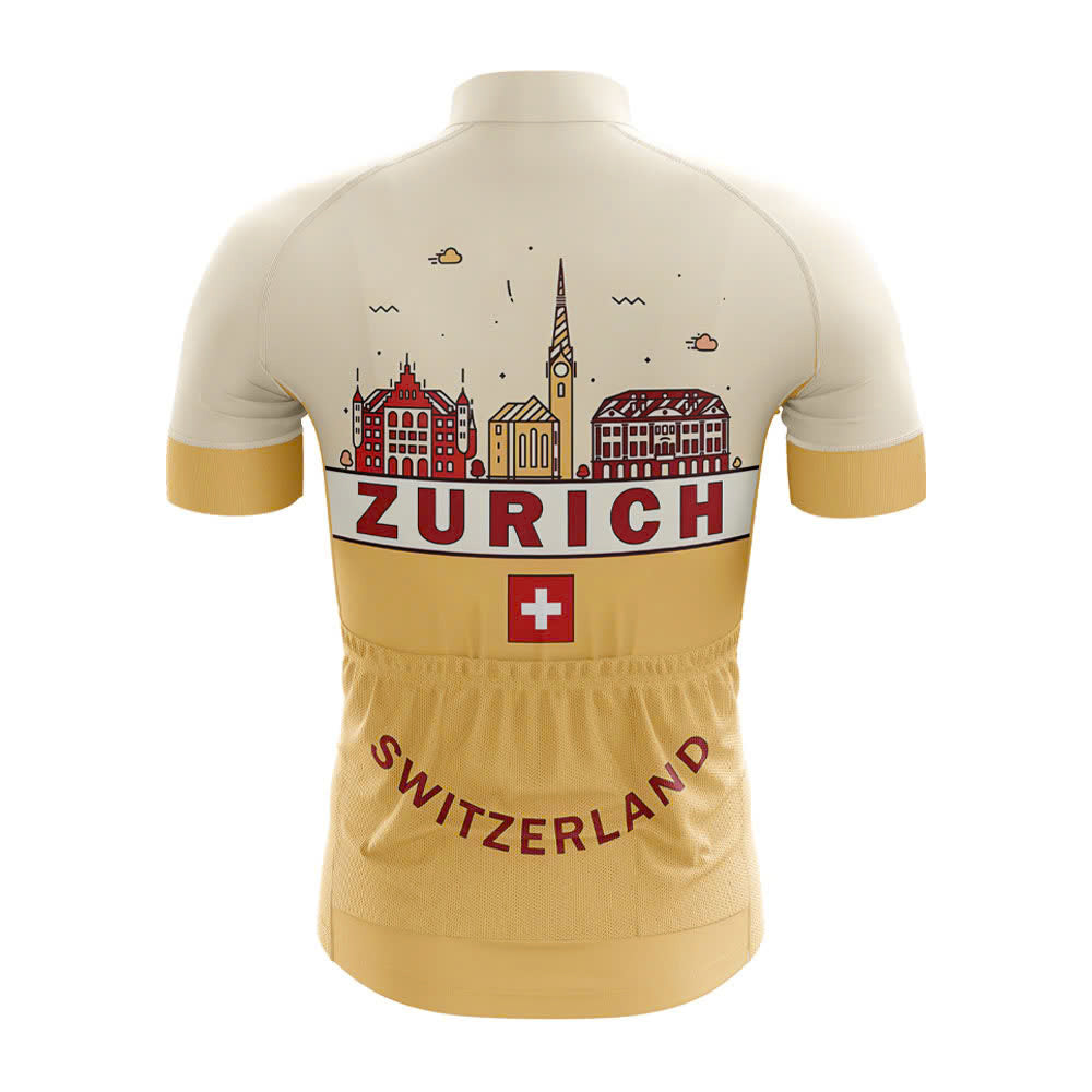 The front of the jersey features an intricately designed skyline of Zurich, Switzerland, complete with iconic landmarks such as the Grossmünster Church and Rathaus. This artistic representation is not just visually appealing but also serves as a nod to the rich history and culture of Zurich. The bold red text spelling "ZURICH" stands out against the beige background, making it easy to identify your brand on the road. Below the cityscape, the word "SWITZERLAND" arches gracefully, accompanied by a Swiss flag, reinforcing the connection to this beautiful country.