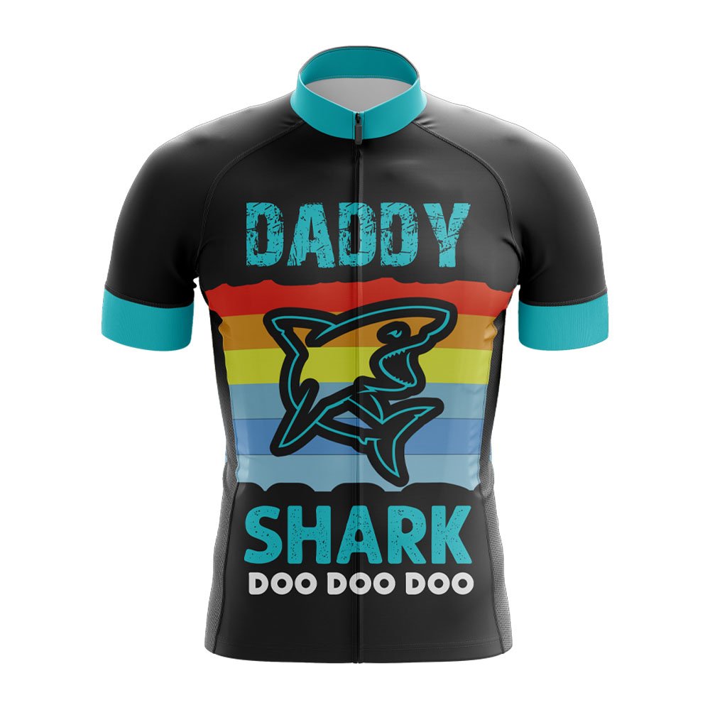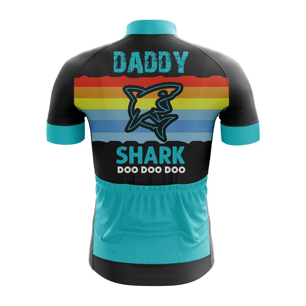 The jersey's design is both functional and stylish. The front features a large, eye-catching shark graphic in turquoise, with the words "DADDY SHARK" arched above it in a distressed font. Below the shark, the phrase "DOO DOO DOO" is written in white, echoing the popular children's song. This playful nod to pop culture makes the jersey not only suitable for serious cyclists but also perfect for those who want to show off their fun-loving side.
