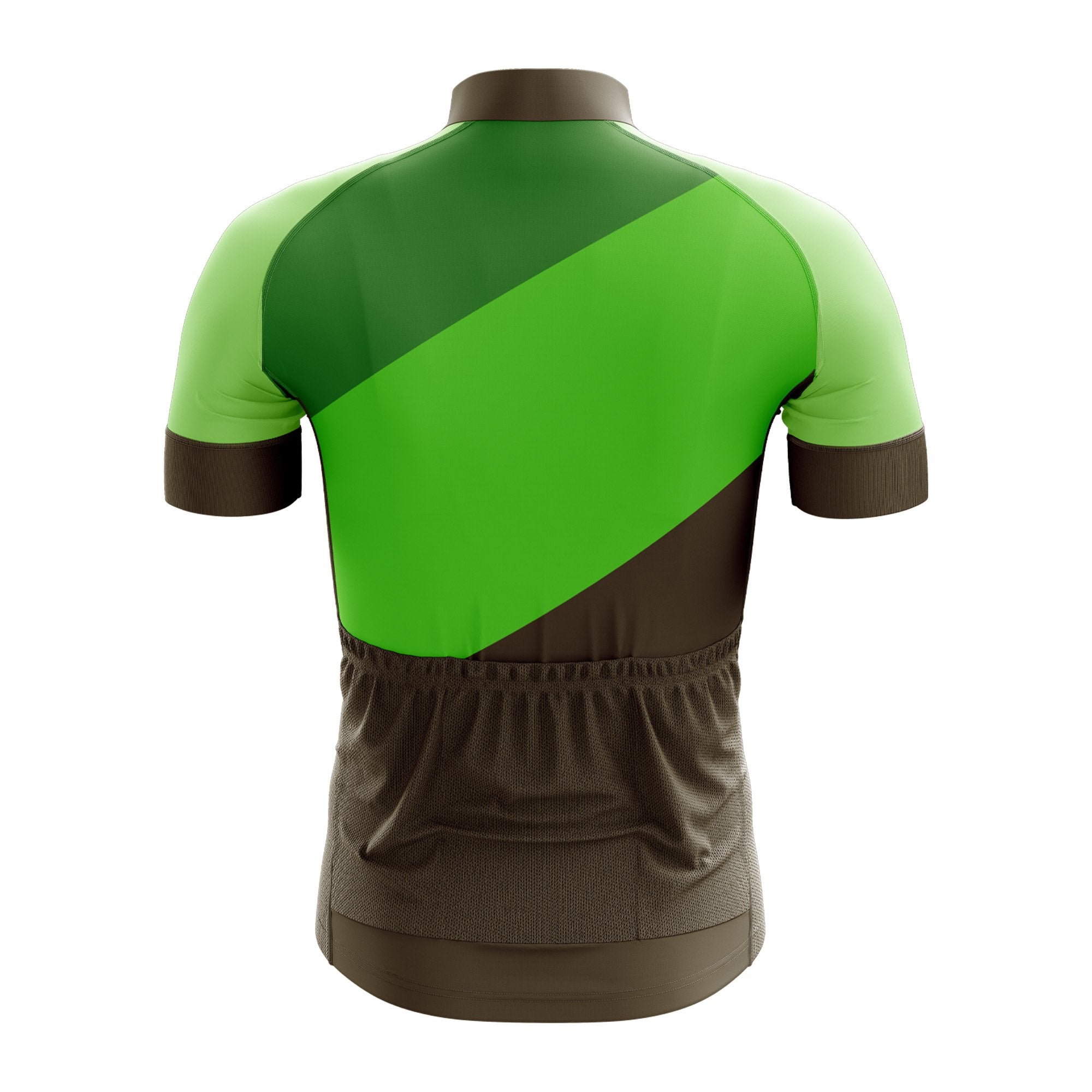 The jersey features a striking color scheme of vibrant green and deep brown, reminiscent of lush forests and rich earth tones. The green sections are adorned with subtle diagonal patterns that add a touch of sophistication without compromising on breathability. The brown accents provide a grounding contrast, enhancing the overall aesthetic appeal.