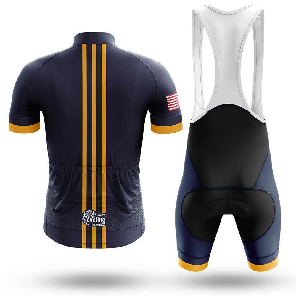 Complementing the jersey is the matching bib shorts, which are cut from high-quality, moisture-wicking material to keep you dry and cool throughout your journey. The white bib straps offer additional support and adjustability, ensuring a snug yet comfortable fit. The navy blue chamois pad provides exceptional cushioning, reducing fatigue and discomfort during long rides. The gold trim at the hem adds a subtle yet striking detail that ties the entire set together.
