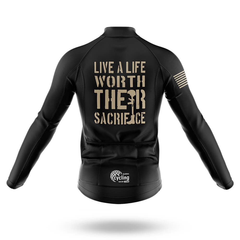 The jersey boasts a striking black base with bold, distressed beige lettering that reads "LIVE A LIFE WORTH THEIR SACRIFICE." The design is reminiscent of battle flags, evoking a sense of honor and dedication. The front features a subtle American flag patch on the left sleeve, adding a patriotic touch to this powerful statement. The jersey's zipper closure offers easy access and ventilation, while the short sleeves provide optimal breathability in warm weather.