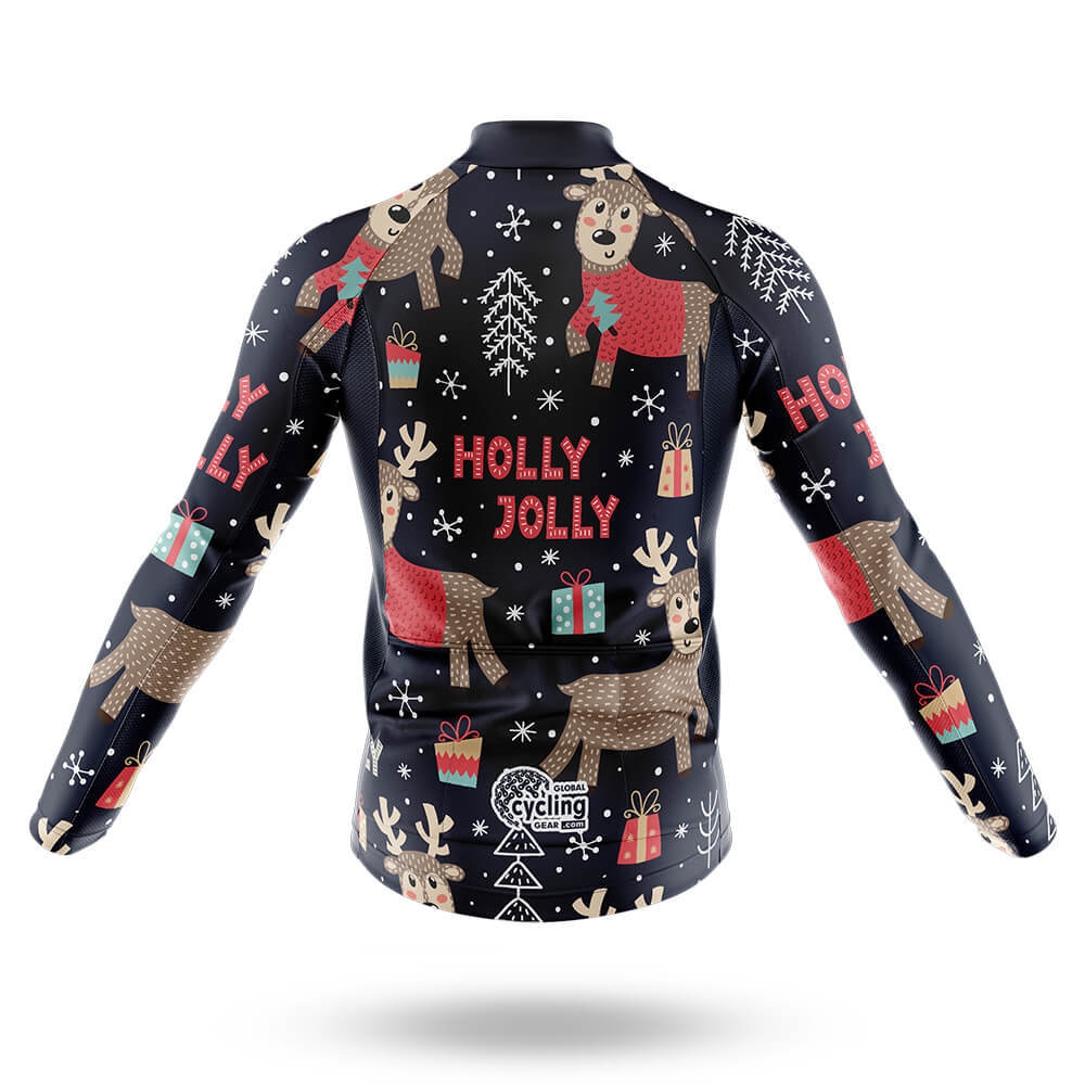 The Holly Jolly Cycling Kit features a rich navy blue base adorned with playful holiday-themed illustrations. The design is vibrant yet understated, ensuring that you stand out without overwhelming the scene. The illustrations include cheerful reindeer, wrapped presents, and delicate snowflakes, all rendered in soft pastel hues of pink, green, and white. These elements create a cozy, wintry atmosphere that's perfect for the season.