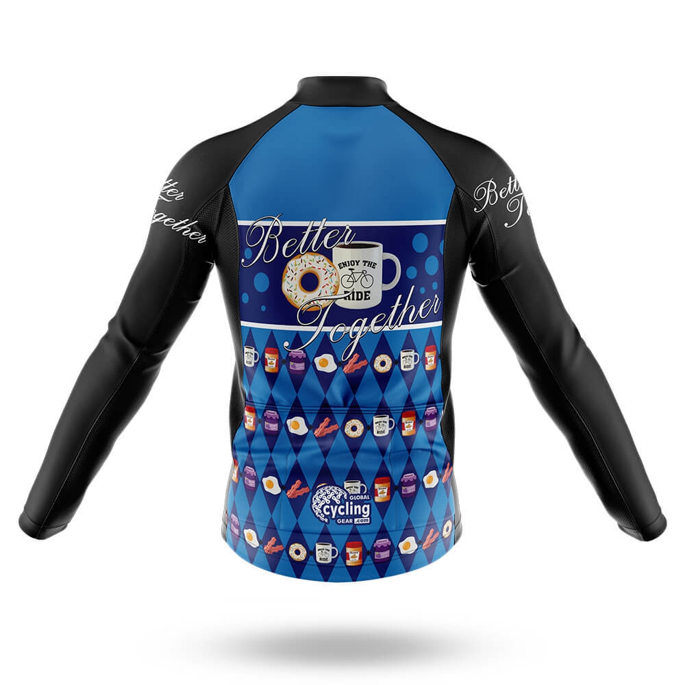 Introducing the Better Together Cycling Kit Full Set, a vibrant and playful ensemble designed to make your cycling journey as enjoyable as your morning routine. This full set features a striking combination of deep blue and rich black, accented with crisp white trim that adds a touch of elegance and contrast. The jersey's front is adorned with a whimsical pattern inspired by breakfast essentials—donuts, coffee cups, bacon, eggs, and jars of jam—arranged in a geometric diamond design. Each element is rendered in warm, inviting colors that evoke the comforting feeling of starting the day right.