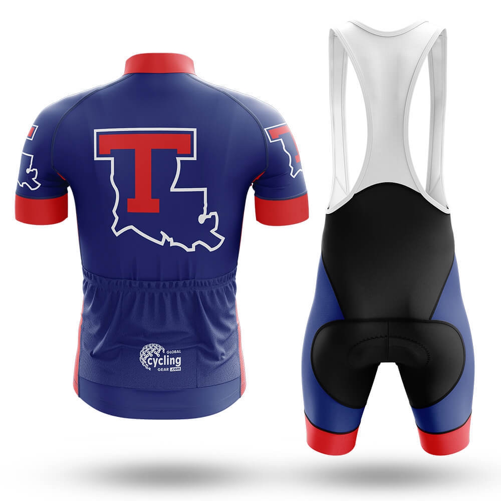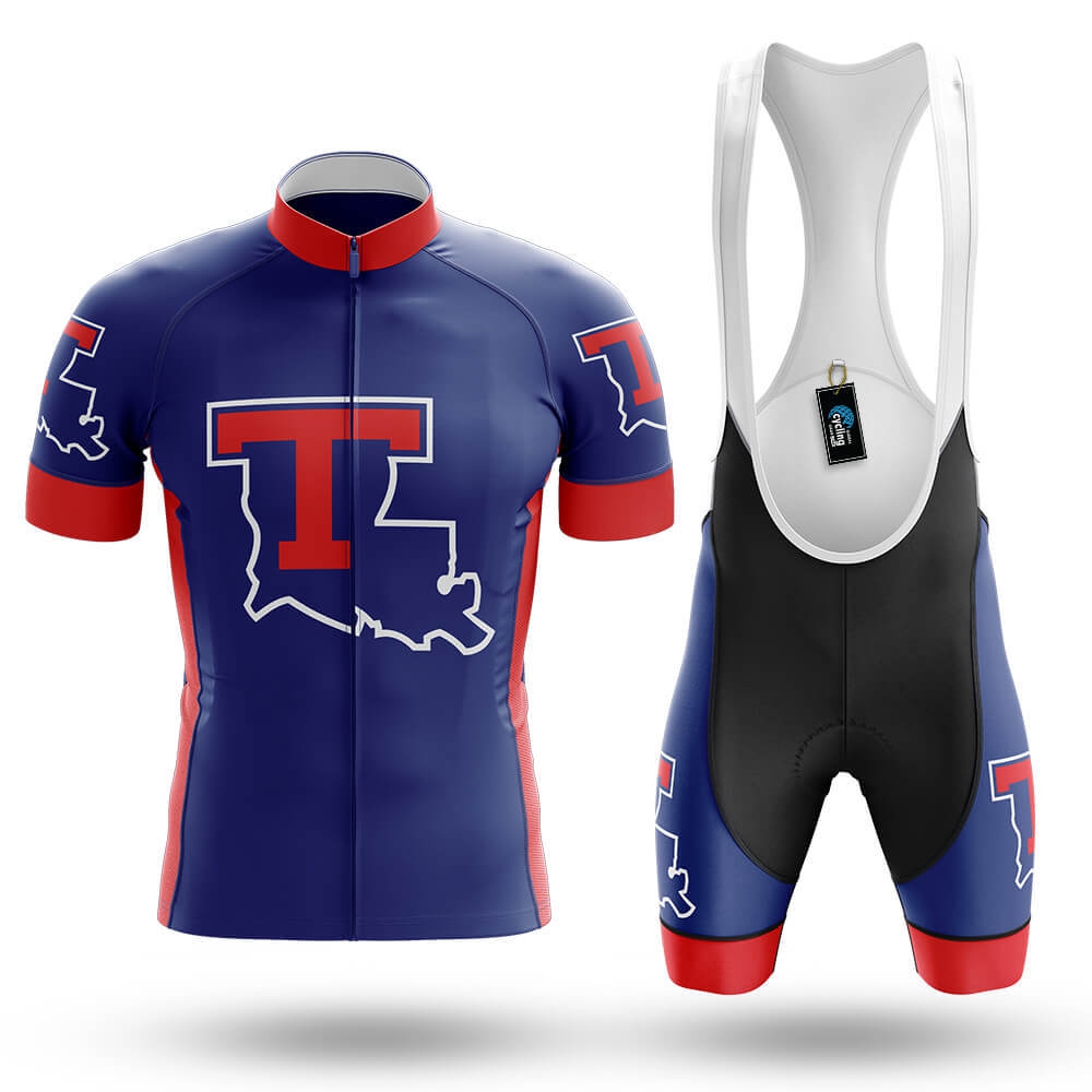 The jersey features a rich navy blue base color, complemented by bold red accents on the sleeves and shoulders, creating a striking contrast. The front of the jersey showcases the iconic "T" logo of Louisiana Tech University, overlaid on a white silhouette of the state of Louisiana, adding a unique and patriotic touch. The zipper runs down the center, ensuring easy access and ventilation during intense rides. The collar is lined with a subtle red trim, enhancing the overall aesthetic appeal.