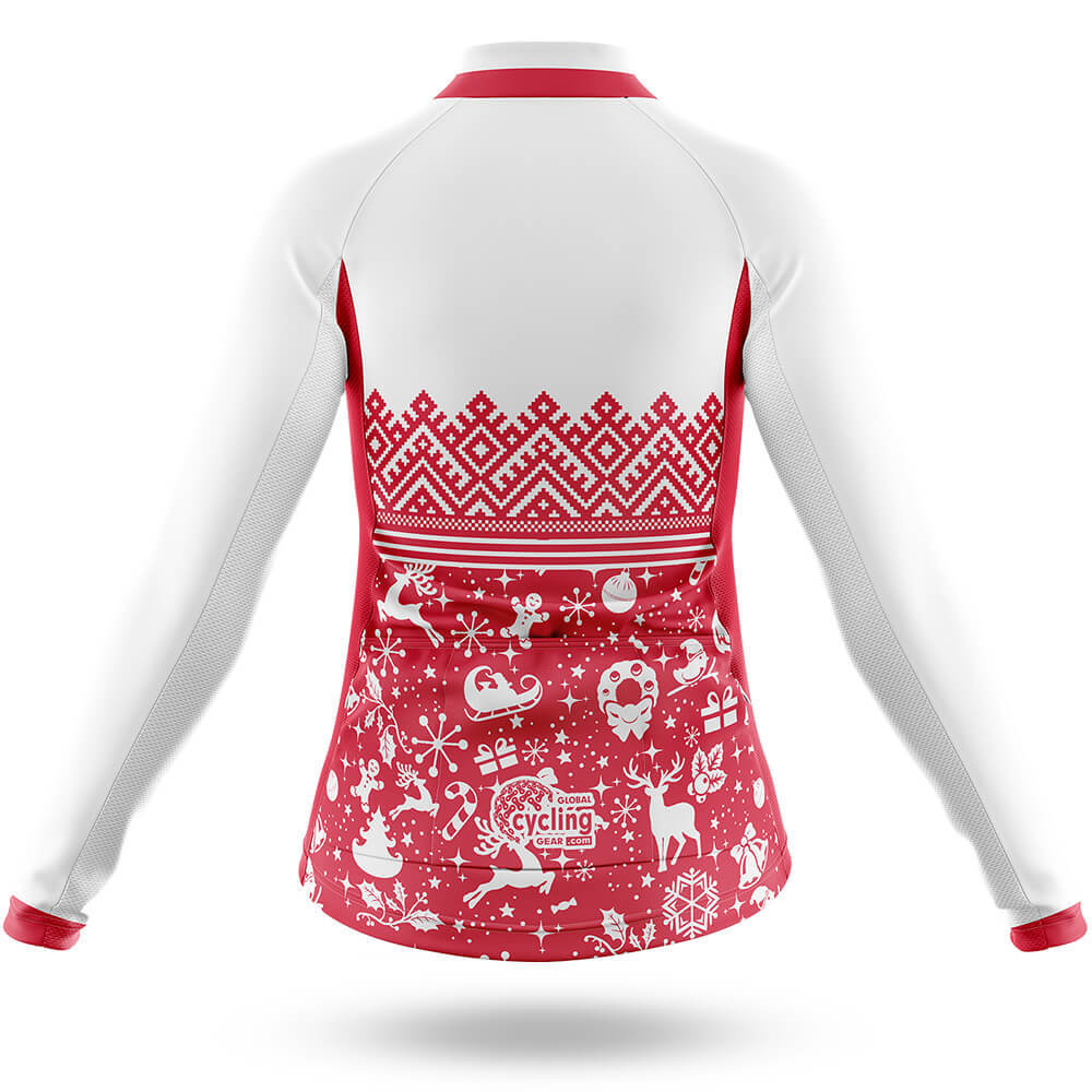 The jersey features a unique snowflake pattern adorned with playful reindeer, Santa Claus, and other holiday-themed motifs, all rendered in delicate white against the rich red background. This intricate design not only adds a touch of whimsy but also ensures maximum visibility for safety during low-light conditions. The long sleeves provide excellent coverage and warmth, making it perfect for cooler weather rides.