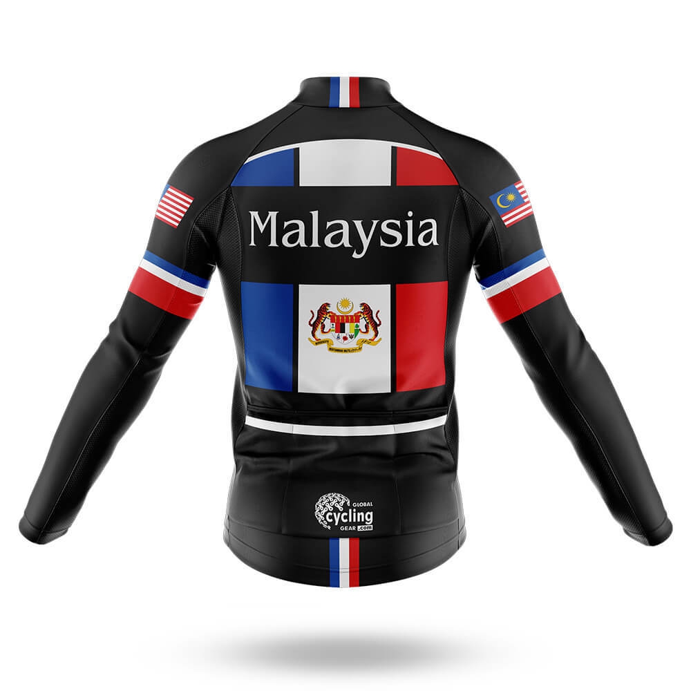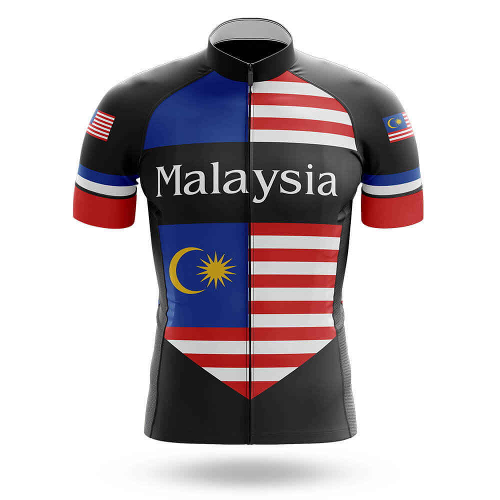 The jersey features a striking color palette inspired by the national flag of Malaysia. The dominant black background serves as a canvas for vibrant red, white, and blue stripes that run vertically down the front, reminiscent of the country's iconic flag. A bold "Malaysia" text in crisp white lettering sits prominently across the chest, adding a personal touch to your ride. The left sleeve showcases the Malaysian flag, complete with its distinctive crescent moon and star, while the right sleeve displays an American flag, symbolizing unity and diversity.