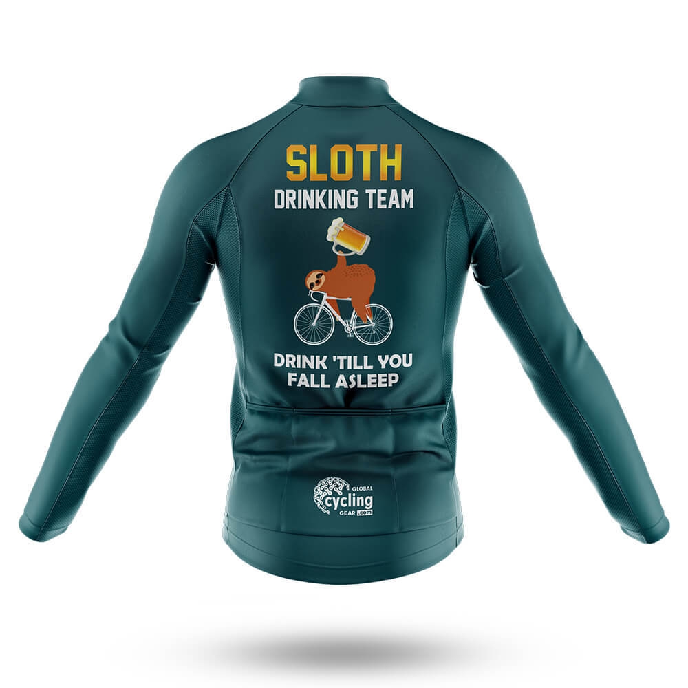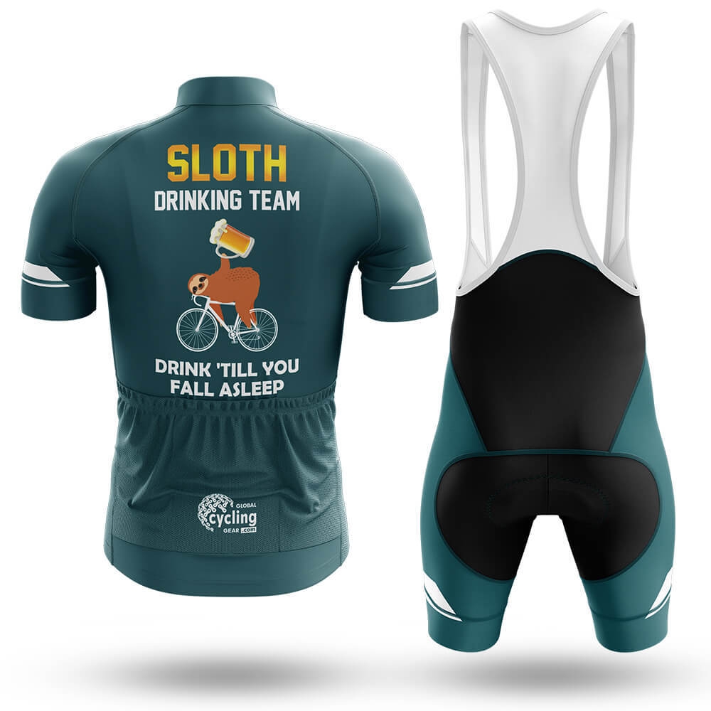 The design is both playful and sophisticated, featuring bold gold lettering that spells out "SLOTH DRINKING TEAM" across the chest. Below the text, an adorable sloth illustration adds a whimsical element to the jersey. The sloth is depicted in mid-action, perched atop a bicycle with a frothy beer mug balanced precariously on its back, perfectly capturing the essence of the "Drunk Till You Fall Asleep" slogan below. This clever graphic ensures that every time you hit the pedals, you'll be turning heads and spreading smiles.