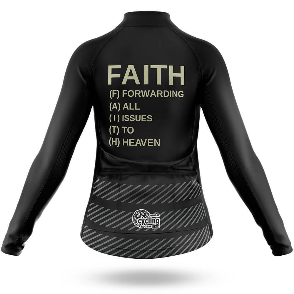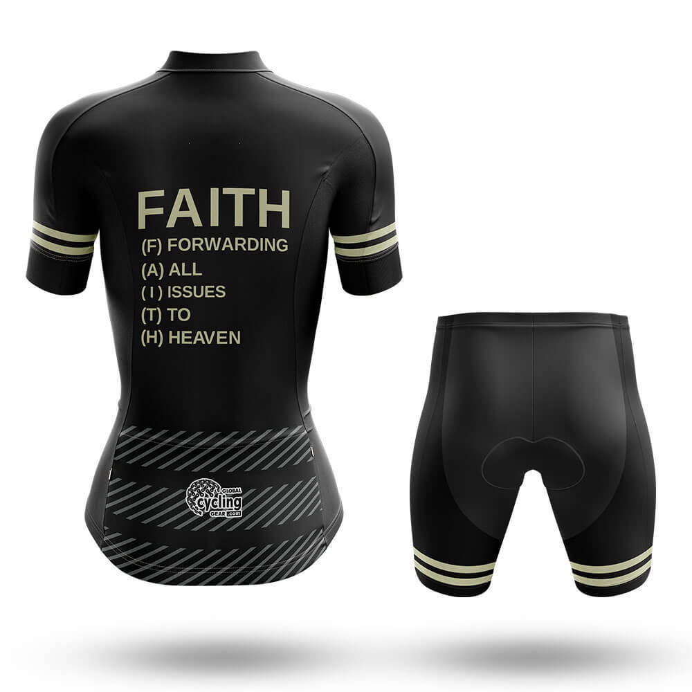 The jersey features a unique design with the word "FAITH" prominently displayed across the chest in bold gold letters. Below it, the acronym "(F) FORWARDING (A) ALL (I) ISSUES (T) TO (H) HEAVEN" is spelled out in smaller gold text, adding a layer of meaning and inspiration to your ride. This thoughtful design element makes you stand out on the road while subtly conveying a message of hope and resilience.