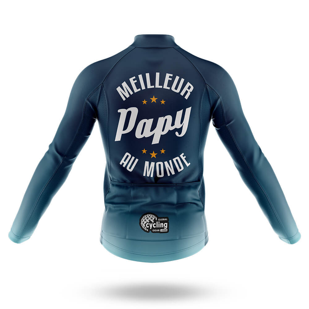 The standout feature of this jersey is undoubtedly its bold "Meilleur Papy" (French for "Best Grandpa") graphic, accompanied by three golden stars. This unique design not only showcases your pride in being the best grandpa but also adds a playful element to your cycling gear. The text is printed in a large, elegant font that stands out against the dark background, ensuring visibility on the road.