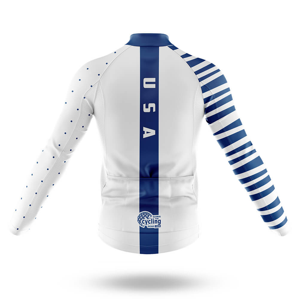Introducing the USA S20 Long Sleeve Cycling Jersey, a masterpiece of performance and style designed for cyclists who demand nothing less than the best. Crafted from high-quality, moisture-wicking fabric, this jersey ensures you stay cool and dry during intense rides. The sleek white base is adorned with bold navy blue accents that not only enhance its aesthetic appeal but also provide excellent visibility on the road.