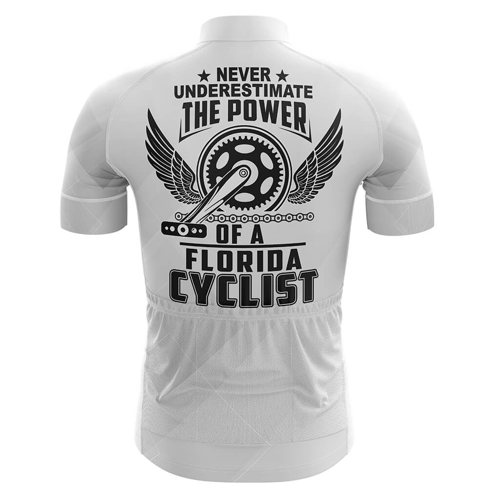 At the heart of this jersey lies an empowering message: "NEVER UNDERESTIMATE THE POWER OF A FLORIDA CYCLIST." This slogan is emblazoned across the chest in bold, black lettering, accompanied by a striking graphic of wings and gears. These elements symbolize strength, speed, and the freedom of the open road. The combination of text and imagery creates a powerful visual narrative that resonates with cyclists who take pride in their journey.