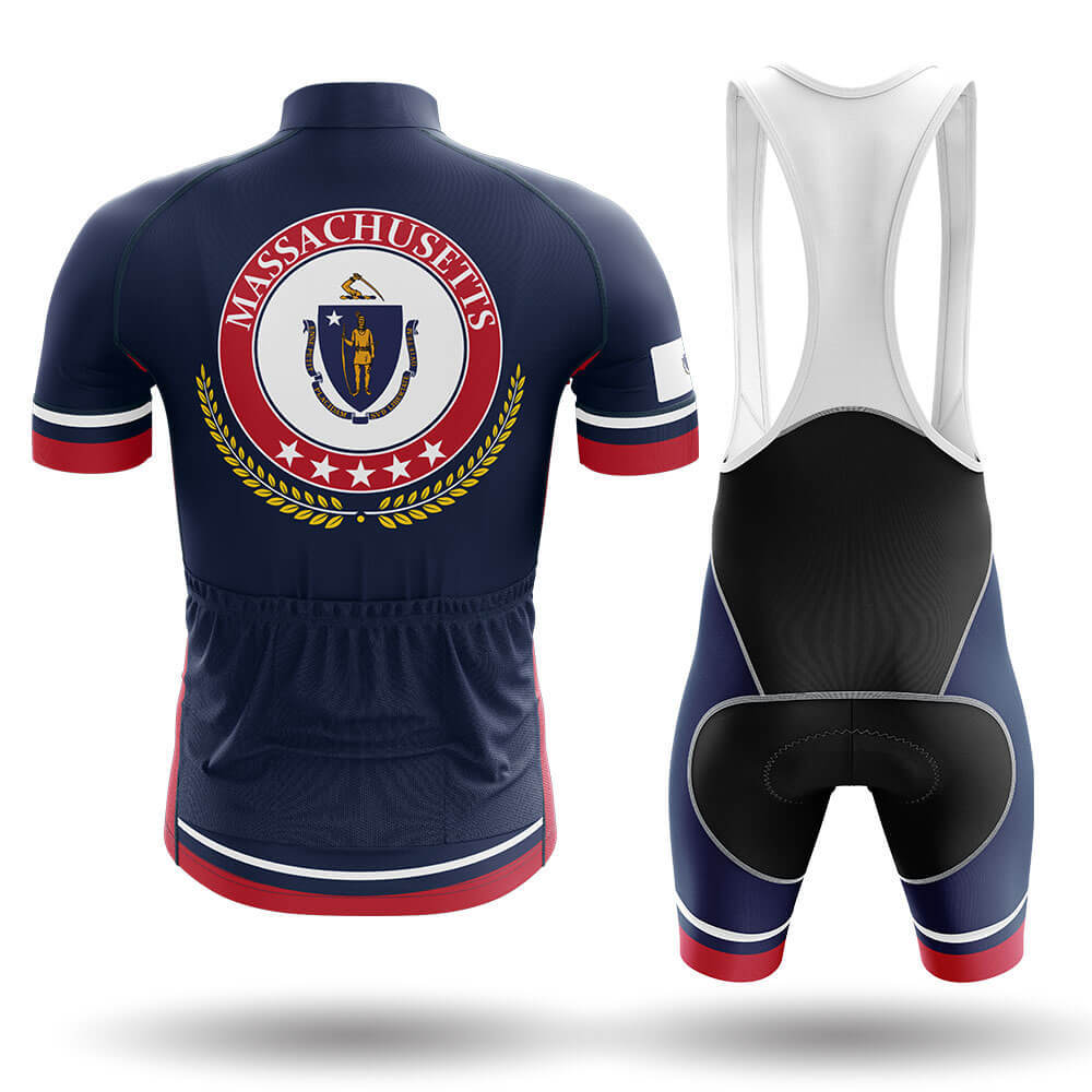 At the center of the chest, the Massachusetts shield logo stands out prominently. Encased in a circular frame, the shield design is adorned with laurel branches symbolizing victory and honor, while the stars represent the 50 states of the United States. This unique emblem not only adds a touch of pride but also serves as a conversation starter among fellow cyclists.