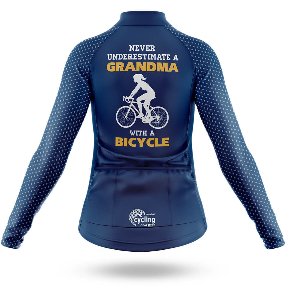 The jersey features a unique design that reads "NEVER UNDERESTIMATE A GRANDMA WITH A BICYCLE" in bold, gold lettering, accompanied by an illustration of a determined grandma riding her bicycle. This not only adds a touch of humor and personality but also serves as a powerful reminder of the indomitable spirit of grandmas everywhere. The short-sleeved cut ensures maximum airflow, keeping you cool and focused during your rides.