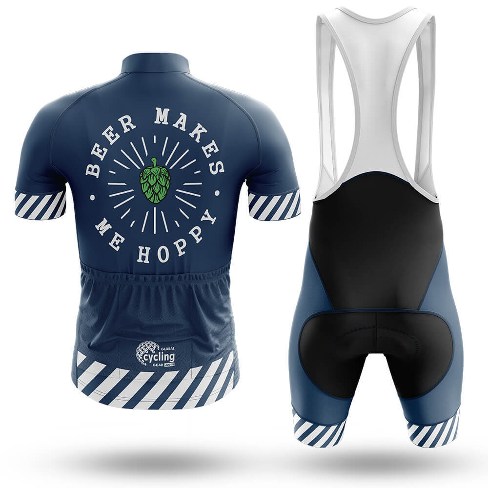 At the center of the chest, a large circular logo proudly proclaims "BEER MAKES ME HOPPY" in crisp white lettering, surrounded by radiating lines that evoke the sunburst effect of a hop cone. This unique design element immediately draws attention and conveys a sense of fun and camaraderie among fellow beer enthusiasts. A vibrant green hop cone illustration sits at the heart of the logo, symbolizing the core ingredient that brings so much joy to our lives.