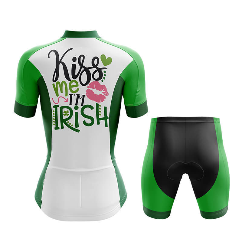 The standout feature of this jersey is its playful and patriotic design. The phrase "Kiss me, I'm Irish" is elegantly written in bold, black script across the chest, accompanied by charming pink lips and a cheerful green heart. These elements add a touch of whimsy and joy, making it perfect for celebrating St. Patrick's Day or simply expressing your Irish pride year-round. The design is not only eye-catching but also versatile, suitable for casual wear as well as professional cycling events.