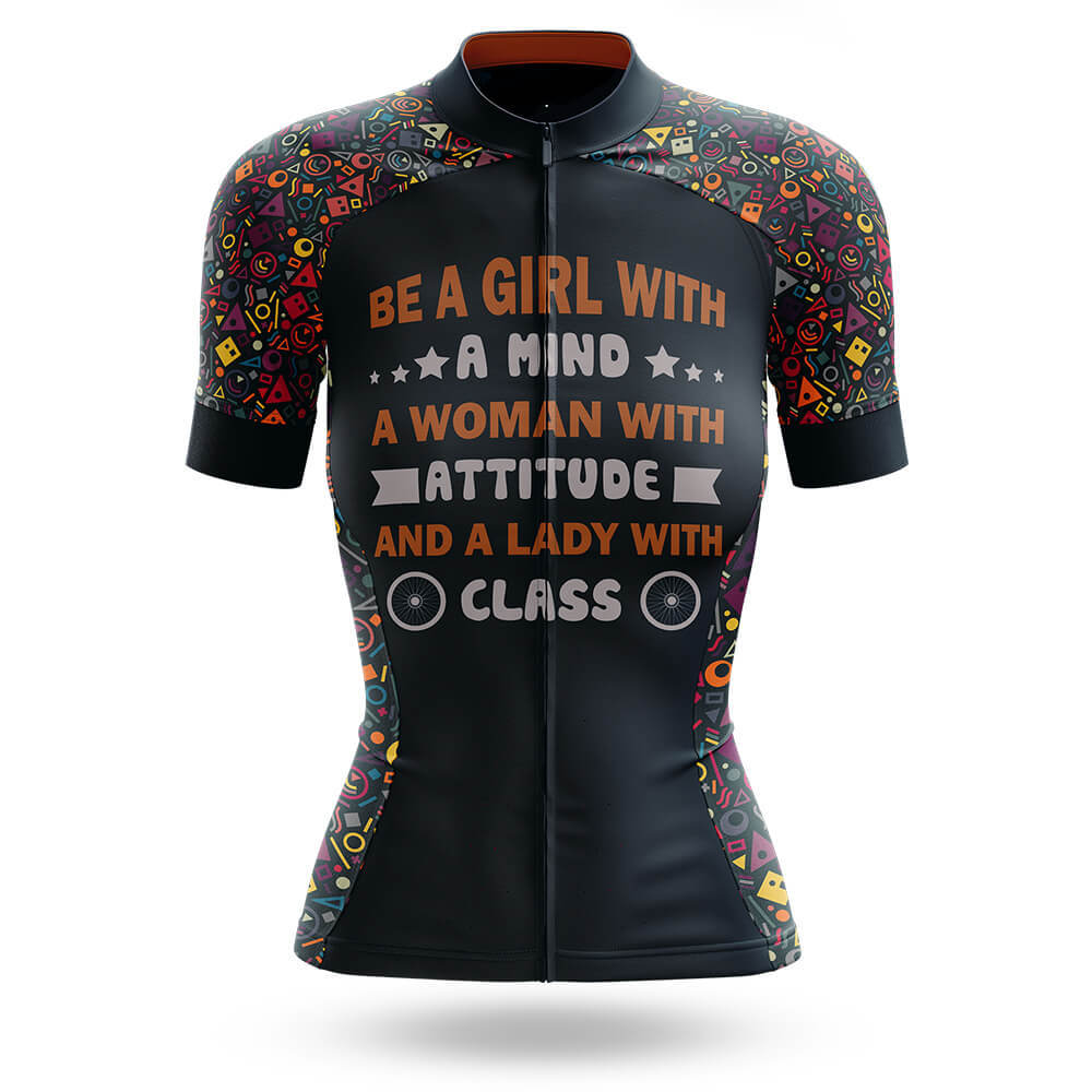 The front of the jersey features an empowering message: "Be a girl with a mind, a woman with attitude, and a lady with class." This motivational quote is displayed in a mix of brown and white fonts, adding a touch of elegance and strength to the design. The text is complemented by decorative elements such as stars and banners, enhancing the overall aesthetic appeal.