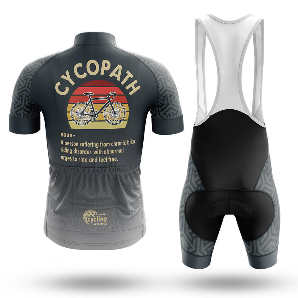 The jersey features a sleek black base adorned with an intricate geometric pattern in shades of gray, creating a sophisticated yet sporty look. The vibrant yellow and red sunburst design behind the word "CYCOPATH" adds a touch of retro flair, reminiscent of classic road bikes. The gold text spelling out "CYCOPATH" and its definition—“A person suffering from chronic bike riding disorder with abnormal urges to ride and feel free”—adds a playful twist, making this kit not just functional but also a conversation starter.