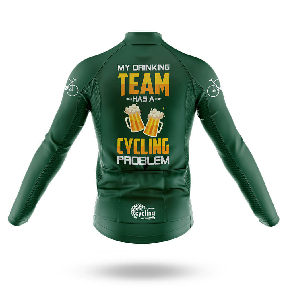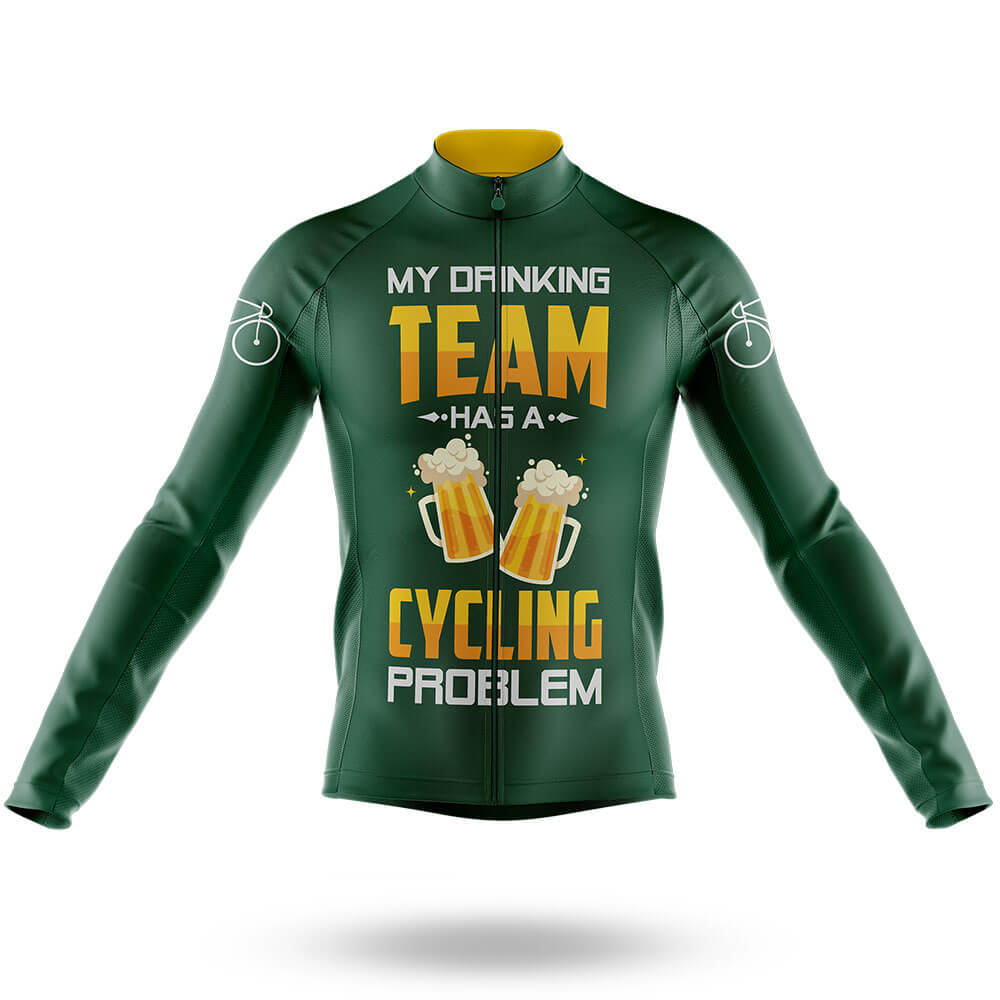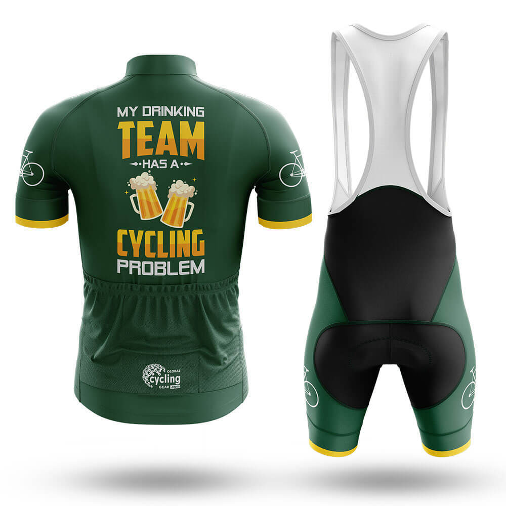 The standout feature of this jersey is its humorous slogan: "My Drinking Team Has a Cycling Problem." This witty message is displayed prominently across the chest in large, bold letters, accompanied by illustrations of two beer mugs clinking together. The combination of text and imagery creates a fun and engaging visual that will surely make you stand out on the road. Whether you're riding with friends or competing in races, this jersey is sure to bring a smile to everyone's face.