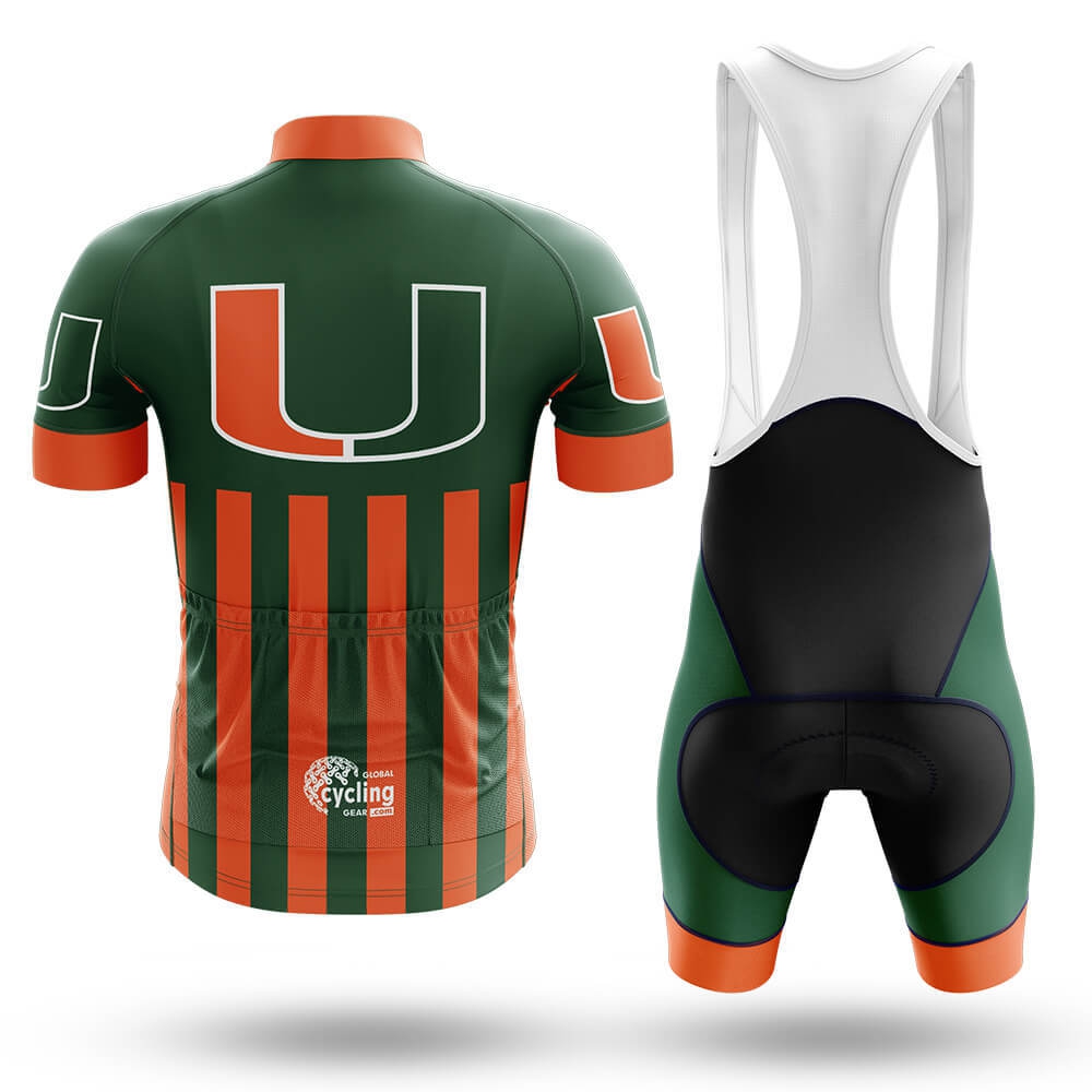 Introducing the Hurricanes USA Cycling Kit Full Set, a sleek and stylish ensemble designed for cyclists who want to stand out on the road. This full set includes a jersey and bib shorts, both featuring vibrant green and bold orange stripes that echo the iconic colors of the Miami Hurricanes football team. The jersey boasts a large, eye-catching "U" logo in white, centered on the chest, with smaller "U" logos adorning the shoulders and sleeves, adding a touch of sophistication and team spirit.