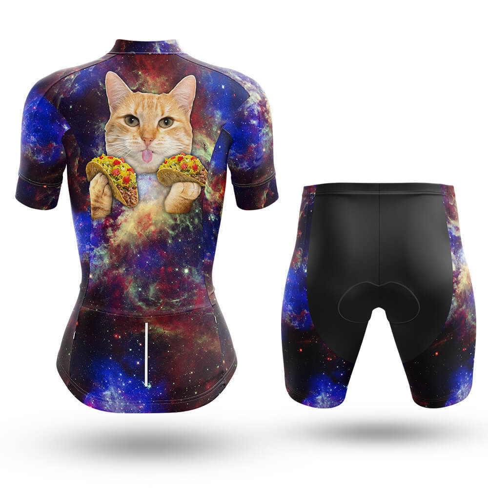 Introducing the Taco Cat - Women's Cycling Kit Full Set, a vibrant and whimsical ensemble that will make you stand out on the road. This cycling kit is designed to be both functional and eye-catching, featuring a galaxy-inspired background with swirling hues of deep blue, purple, and red, reminiscent of the vastness of space. The texture of the fabric is smooth yet durable, ensuring comfort during long rides while maintaining its shape.