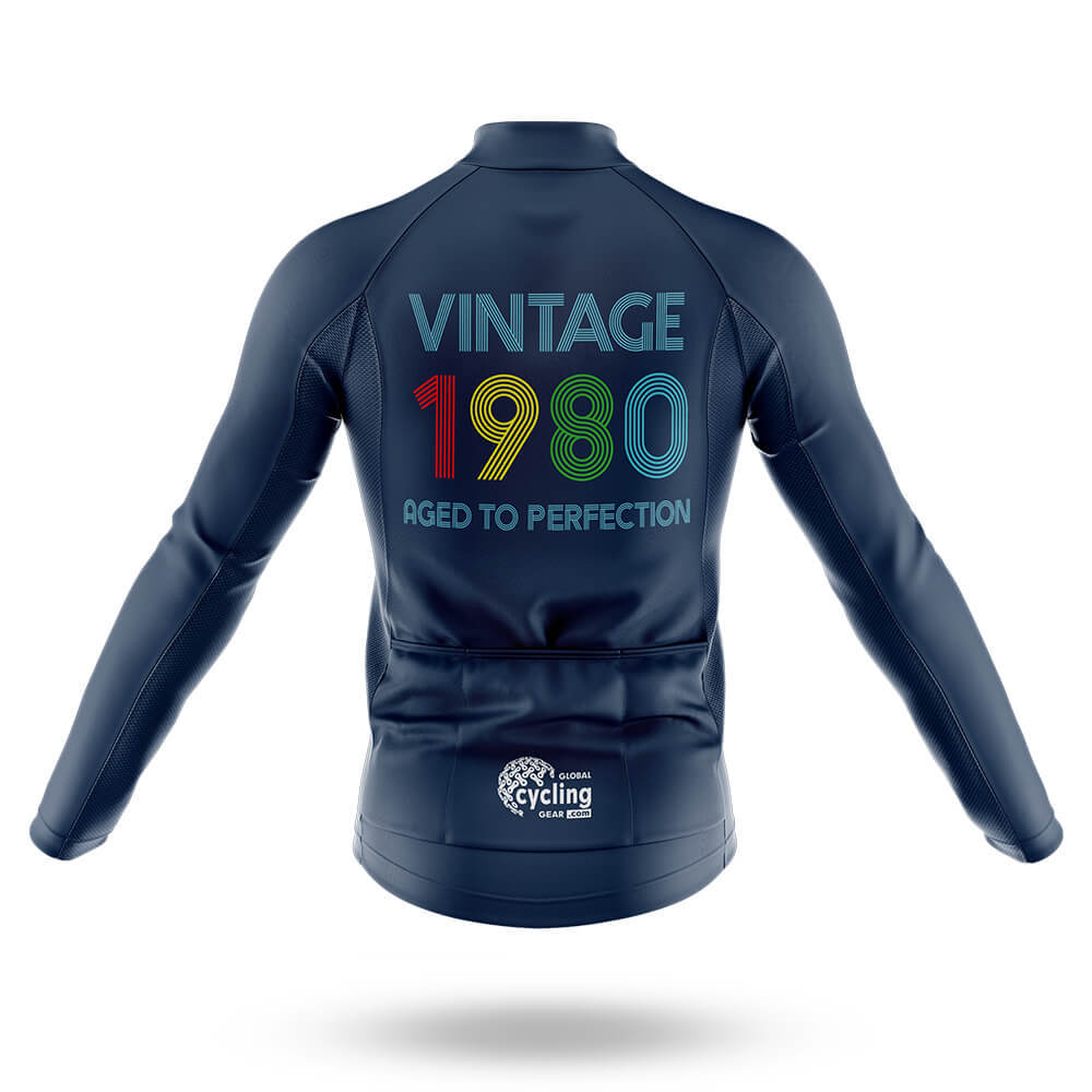 The front of the jersey proudly displays the phrase "Vintage 1980 Aged to Perfection" in bold, retro-style lettering. The text is designed with a gradient effect, transitioning from red to yellow to green to blue, evoking the nostalgic charm of the 1980s. This unique design element makes it perfect for those who want to celebrate their age with a touch of vintage flair.