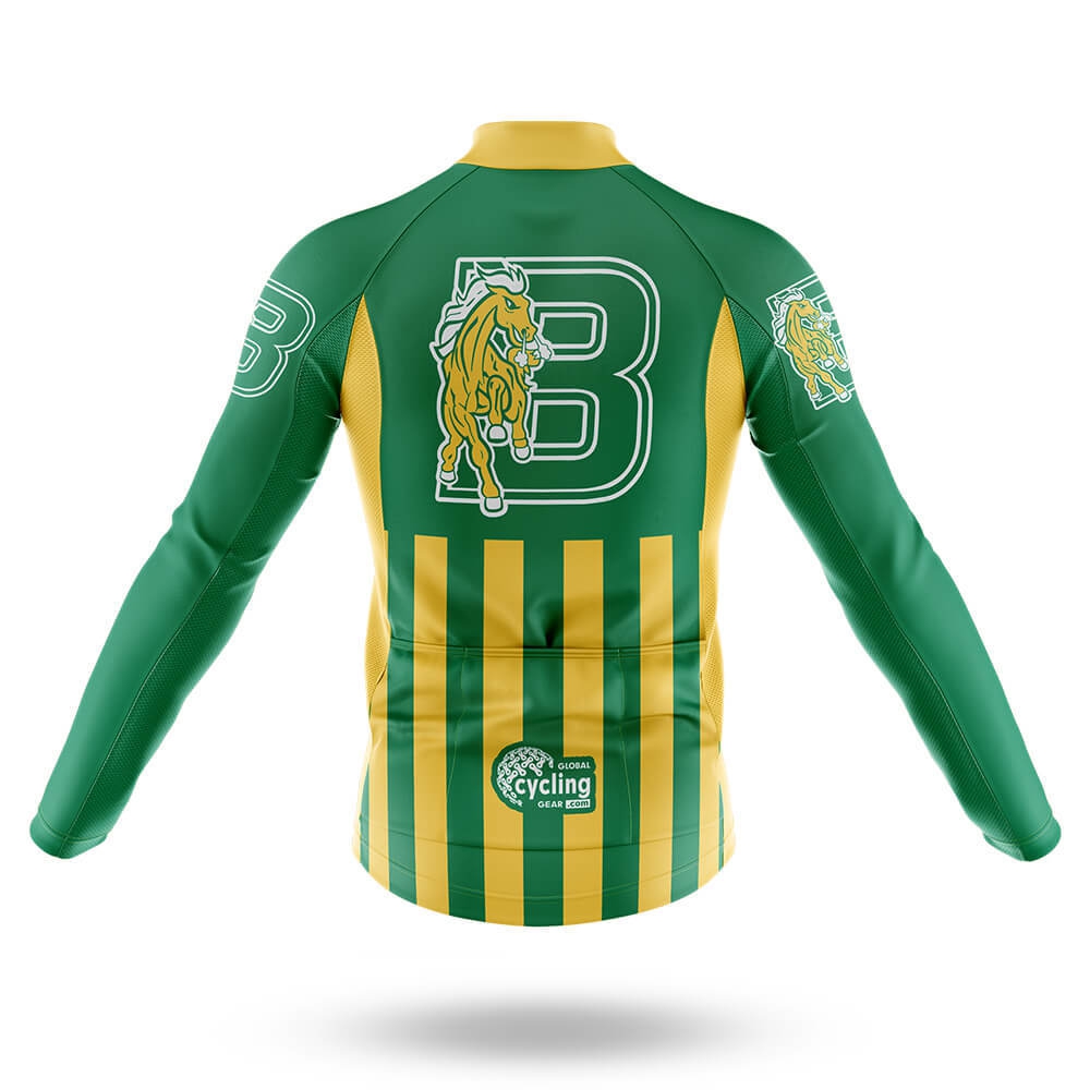 At the center of the jersey, a large white "B" stands out against the green background, symbolizing the strength and resilience of Bronx Community College. Flanking this central design are two striking images of a horse, one on each sleeve. These horses represent speed, agility, and the untamed spirit of the American West, adding an element of adventure and freedom to the jersey's aesthetic.