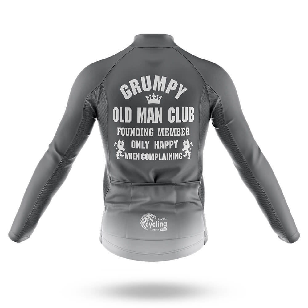 The jersey is crafted from high-quality, moisture-wicking fabric that keeps you dry and cool during your rides. The color scheme is a sophisticated blend of dark gray and white, giving it a classic yet modern look. The texture is smooth and slightly stretchy, ensuring a snug fit that allows for maximum freedom of movement. The design features a playful slogan: "Grumpy Old Man Club - Founding Member - Only Happy When Complaining," printed in crisp white lettering across the chest. A small crown and lion emblem add a touch of regal flair, making this kit not just functional but also a statement piece.